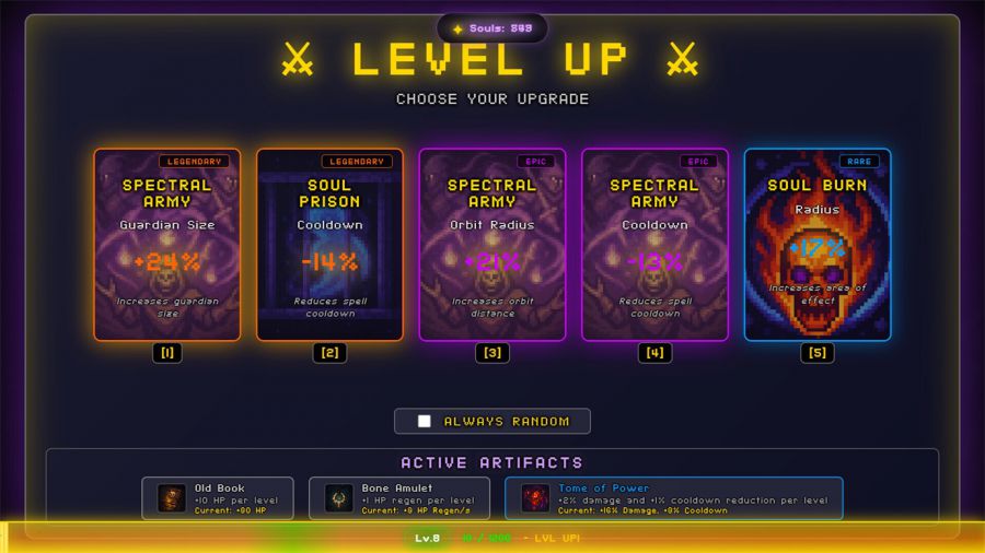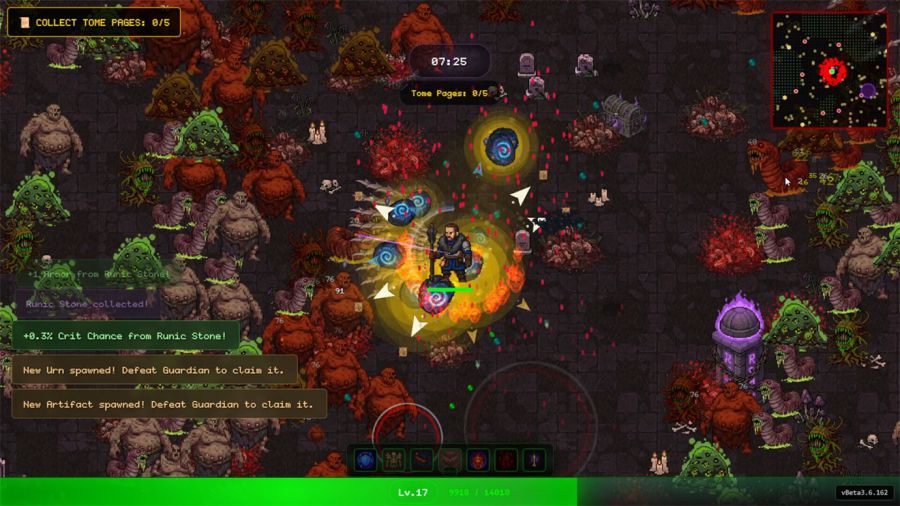 并不是说这段试玩味如嚼蜡,也并不是说所见所感一切存在什么让人完全没法接受的Bug或者雷点,真正的问题在于,我们在《CODEX MORTIS》的Demo中几乎看不到任何“目标性”的设计——启动游戏,点击开始,一边感受手柄震动一边把屏幕上四面八方涌来的敌人像割草一样统统砍倒,四处走动收集掉落的经验然后看着颜色判断稀有度选择升级,尝试在不断涌来的敌人中央尽可能多存活一时片刻——这就是《CODEX MORTIS》的实际体验。