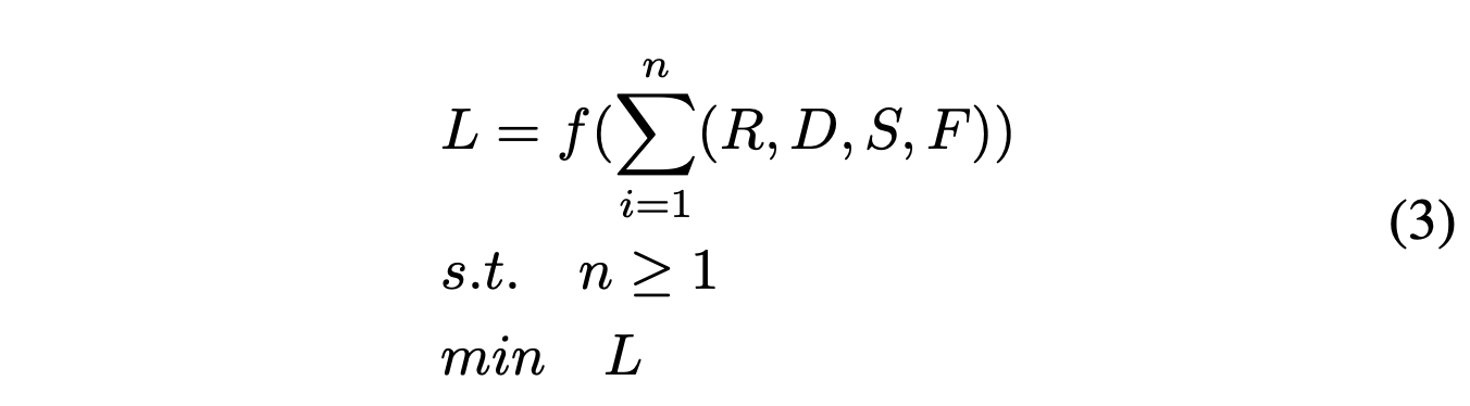 其中,R,D,F 和 S 代表用户、设备、FPS 统计数据(平均值、中值、分位数)和图形设置的数据。 L 表示建模误差。一旦 R,D 确定后,F 可以从历史 n 个版本中得到,S 为推荐的图形设置。