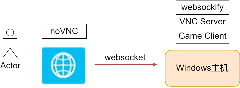 最初,平台计划采用基于Web端的远程桌面控制方案。具体实现为事先在Windows主机上安装好游戏客户端和VNC远程连接工具。用户通过WebSocket协议,可以在浏览器中直接进行远程桌面控制,从而观看远程主机的游戏录像画面。