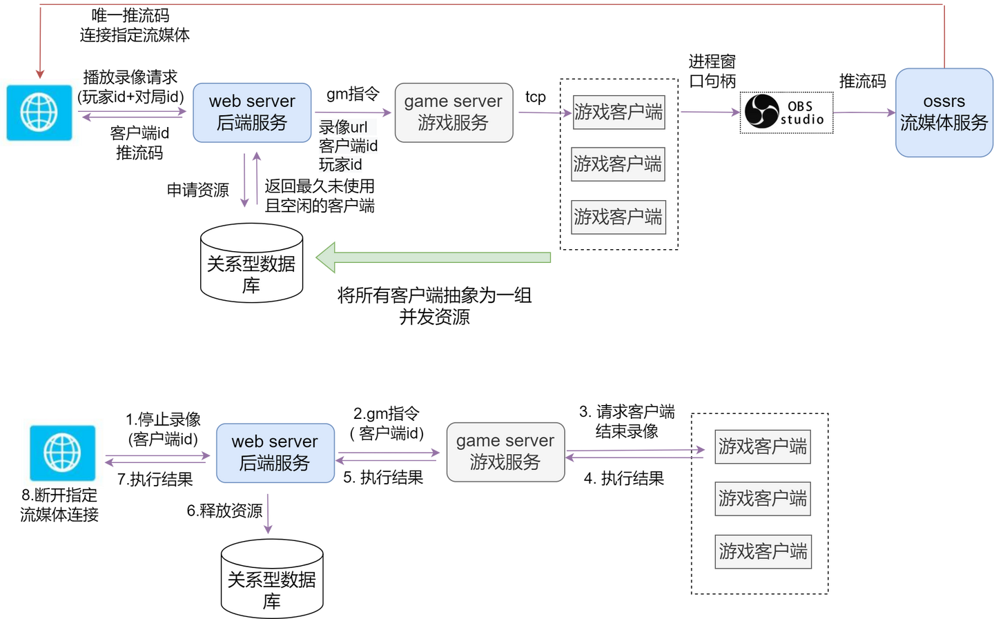 当用户点击播放录像时,前端向后端发送HTTP请求,包含玩家ID和对局ID。后端接收到请求后,将访问关系型数据库以申请空闲的客户端资源。