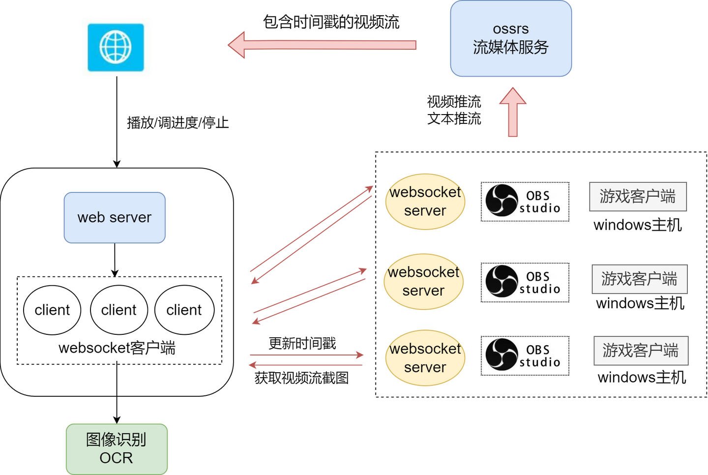 WebSocket插件服务:每个OBS实例都会运行一个WebSocket插件服务,通过WebSocket接口低延迟地获取游戏客户端的画面截图。由于存在多个游戏客户端,Web侧需要维护多个WebSocket客户端,以便对多个直播流进行画面截图。