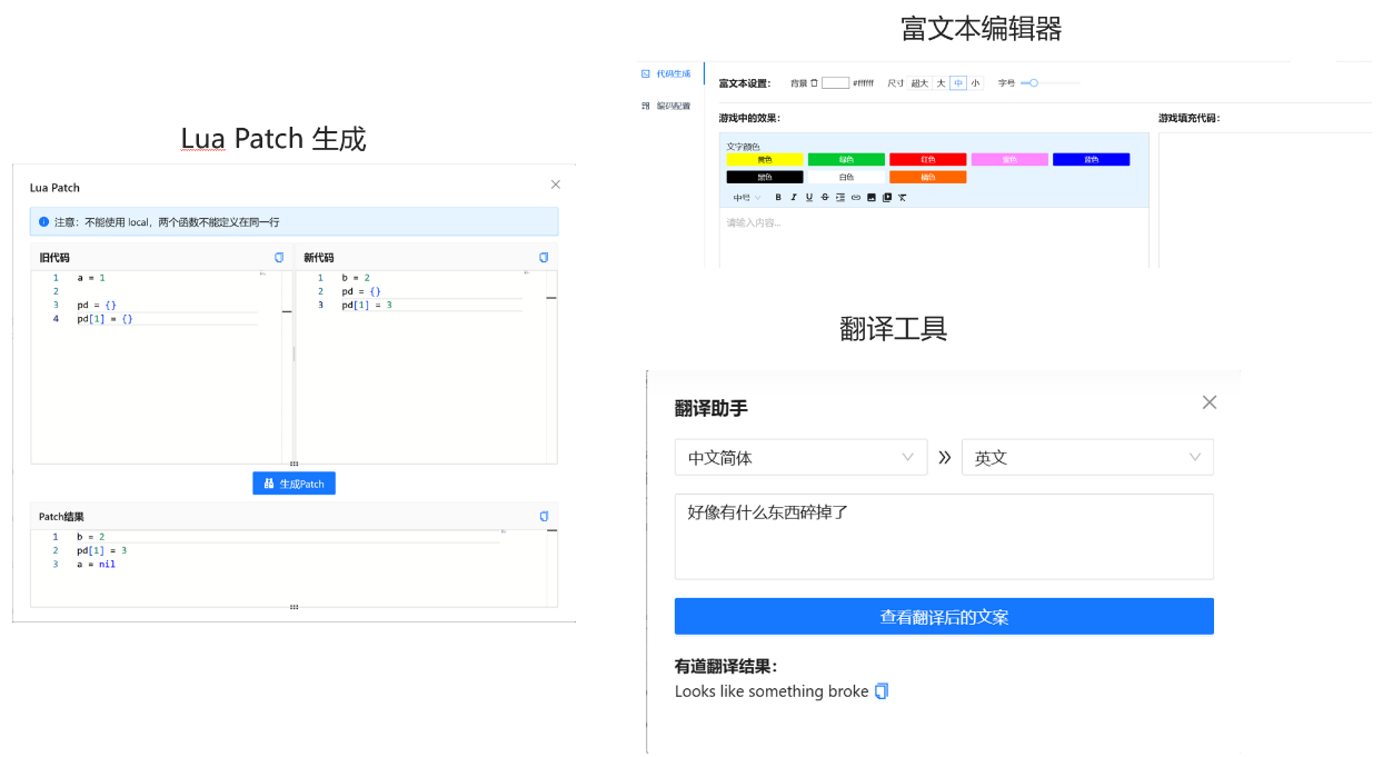 Lua Patch 生成、富文本编辑、数据热更都被纳入到平台的能力中。