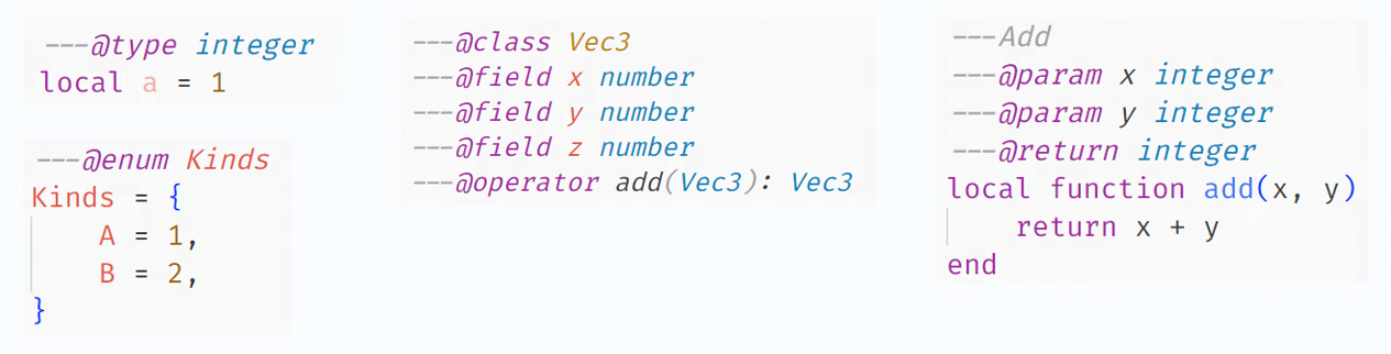 在 Lua 中,我们支持了兼容 EmmyLua 的基于注释的类型注解,为静态分析提供更多类型信息。