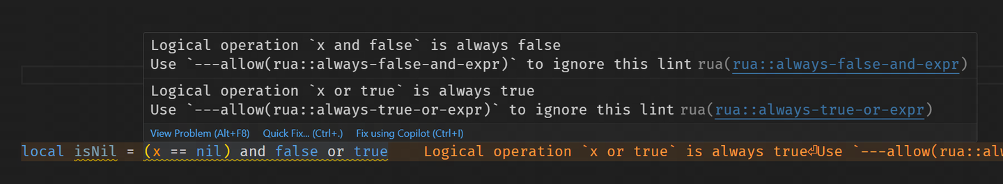 local res = cond and a or b-- 结果永远是 truelocal isNil = (x == nil) and false or true
