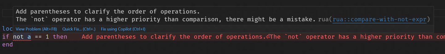 Lua 中 not 运算符的优先级高于比较运算符,在条件判断中使用容易出错。